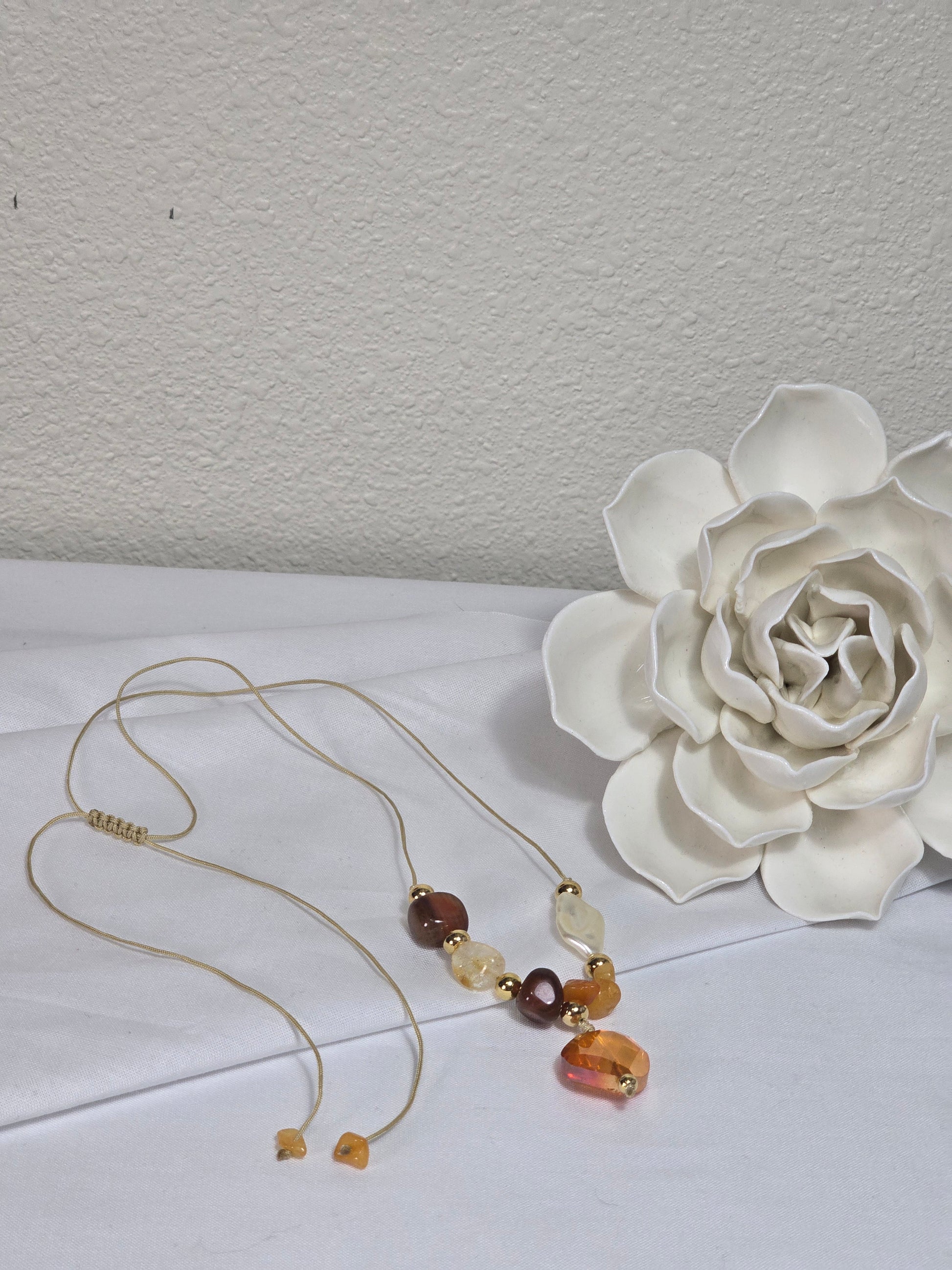 Material: gold plated, nylon string, citrine beads, orange quartz chip, and agate beads.
